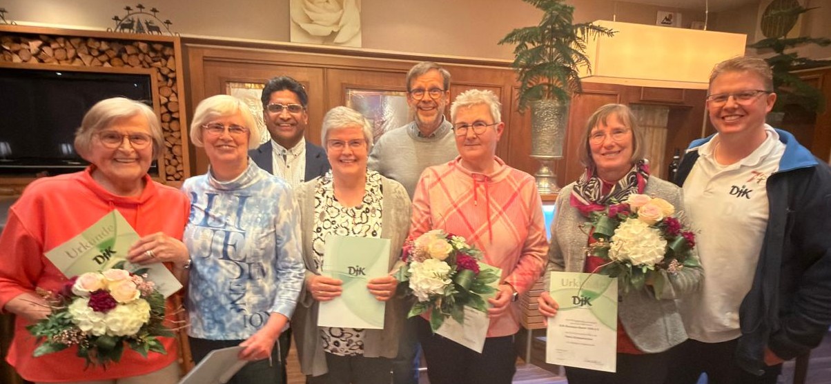 Ilse Hagedorn (DJK Treuenadel in Silber f. 25 Jahre), Annelie Sommer (DJK-Ehrenzeichen in Gold ), Davis Puthussery (geistl. Beirat), Irmgard Meyer (DJK-Ehrenzeichen in Gold), Thomas Pöter ( stellvertr. Vorsitzender ), Angelika Rubbert (DJK Treuenadel in Silber – 25 Jahre), Petra Schwennecker (DJK Treuenadel in Silber – 25 Jahre), Thomas Bartels (stellvertretender Vorsitzender des DJK Diözesanverband Münster) - v.l.n.r.